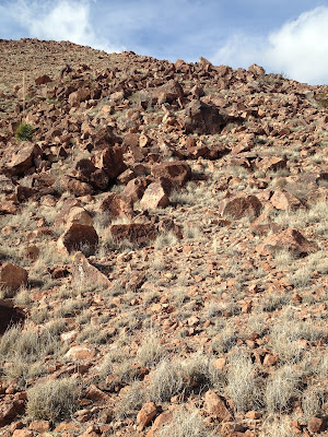 Two years ago I started on the plateau top and went down and around, up and down, exploring the uppermost arroyos.I came upon grinding mortars, a few petroglyphs and a small blackened alcove, but had to turn around before I could explore all the way down to the road. This time I started, after pulling off the paved road a short ways, at the bottom and began exploring upstream. I stayed on the north bank going from boulder to huge boulder, many of which seemed absolutely ripe for finding some rock art,but found none. I did find a a few small mortar holes ( cupules, they are called I later learned) under one with an overhang. I might have thought it was an odd natural formation, but for the fact that they were quite smooth.