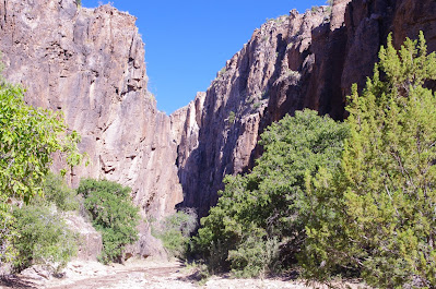 There wasn't, and it became clear that there was little left of what surely had to have been a wonderful riparian area. Vegetation such as hackberry trees, juniper, live oak more closely resembled desert box canyons( such as Broad Canyon) close to my home here in Las Cruces. There were no willows, or cottonwoods streamside and what little grass there was had been nibbled to the nub. Persistent drought conditions and little rest from grazing may have brought this on, but perhaps because the canyon remains dark much of the time due to fact that is only 20-25 feet wide and several hundred feet deep, a more typical riparian area for its 6000 foot elevation has never developed.In the deeper parts of the box, a few box elder showed up as well as as few walnut trees( including one large specimen right at the mouth of Deep Canyon). Grapevines spread luxuriantly over large expanses of the volcanic rock on north facing cliffs as well.