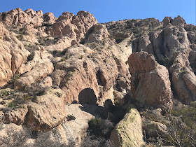 We parked at the trailhead, where there is now a ribbon and " NO VEHICLES" sign across the road that would normally be driven right up to Peña Blanca. The Sierra Vista bike trail which is also right here is the boundary of the wilderness, while the road, which more sensibly should be the boundary, is within it. So, we walked the mile and then began exploring the cliffs, alcoves, caves, and boulders formed in the rhyolite tuff that almost seemed to shimmer in the winter morning light. There are a very few pictographs to see, lines and shapes in red pigment, in some of the shallow recesses, but the black images are charcoal drawings from more recent times.