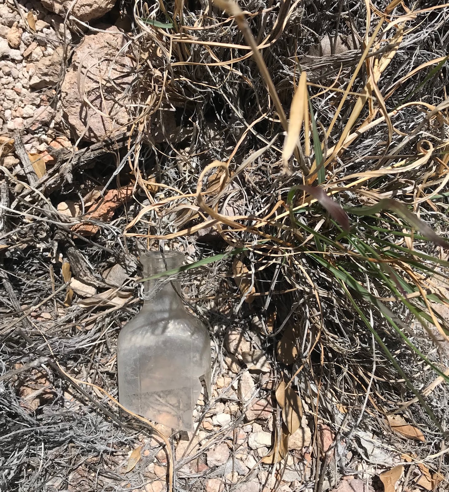As I headed down, I angled out onto the north side of the canyon heading for the alcove I had seen earlier. On my way I found an old broken bottle which assured me I was not the first person stupid enough to come here. Scrub oak tree leaves glowed orange in the sun. Dried grass and gravel crunched beneath my boots. I arrived at a cave, not visible from below, where two juniper limbs were propped up from ceiling to floor. It was large and high enough to easily walk in and had a flat floor where a metate sat dumbly with several rusty paint cans nearby.