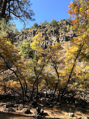 Getting to the first horseshoe bend we entered a beautiful forest of tall pines with the colorful oaks as the understory. An actual rocky creek channel appeared in this section as well with the bright yellows of willows and boxelders along its banks. We ambled on, constantly looking up at the towering walls of the canyon with evergreens mixed in with the display of deciduous shrubs and trees. We passed gigantic talus fields made up of boulder-sized rocks. At the base of one, near the apex of an ox-bow, where it stays dark and cool most of the time, there were even a few aspens.