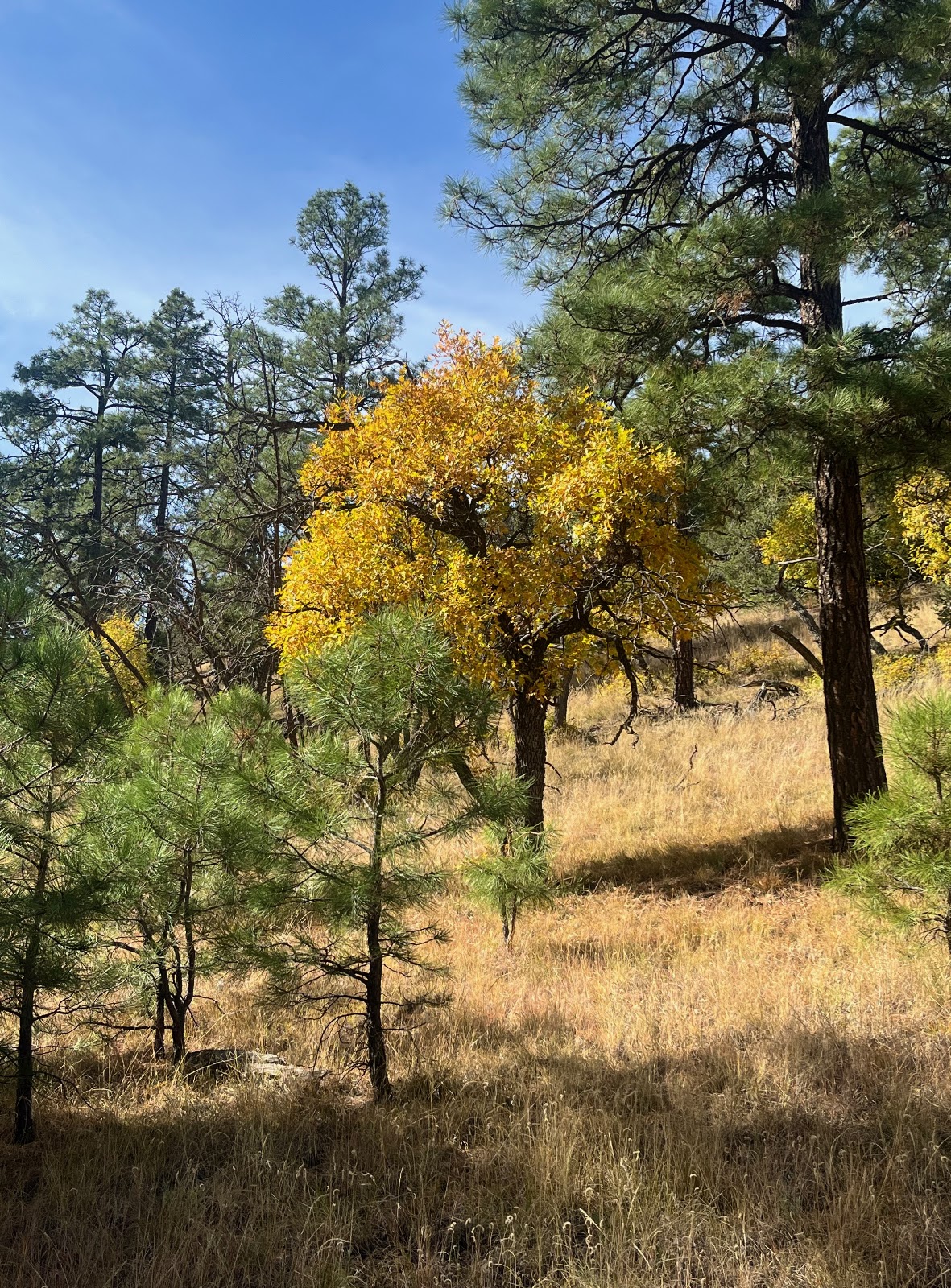 Leaves are falling fast here in Las Cruces. They had barely turned color and now they are on the ground.  We did a nice walk on the NMSU campus yesterday to enjoy the fall display there. I only got out to enjoy a couple color excursions in the forest this fall. One was a hike to the canyon just east of our cabin on Horse Mountain. The other was a drive up Karr Canyon in the Lincoln National Forest. Unfortunately my fall break (last week of September, first week of October) is too early to see color almost anywhere in southern New Mexico. Aspen and maple photos (above this text) are from Karr Canyon. Oak photos (below the text) are from Horse Mountain. Enjoy!